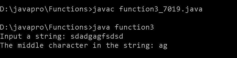 System.out.print("The middle character in the string: " + middle(str)+"\n");