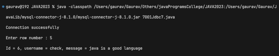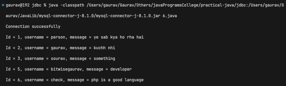 System.out.println("Id = " + resultSet.getInt("id") + ", username = " + resultSet.getString("username") + ", message = " + resultSet.getString("message"));