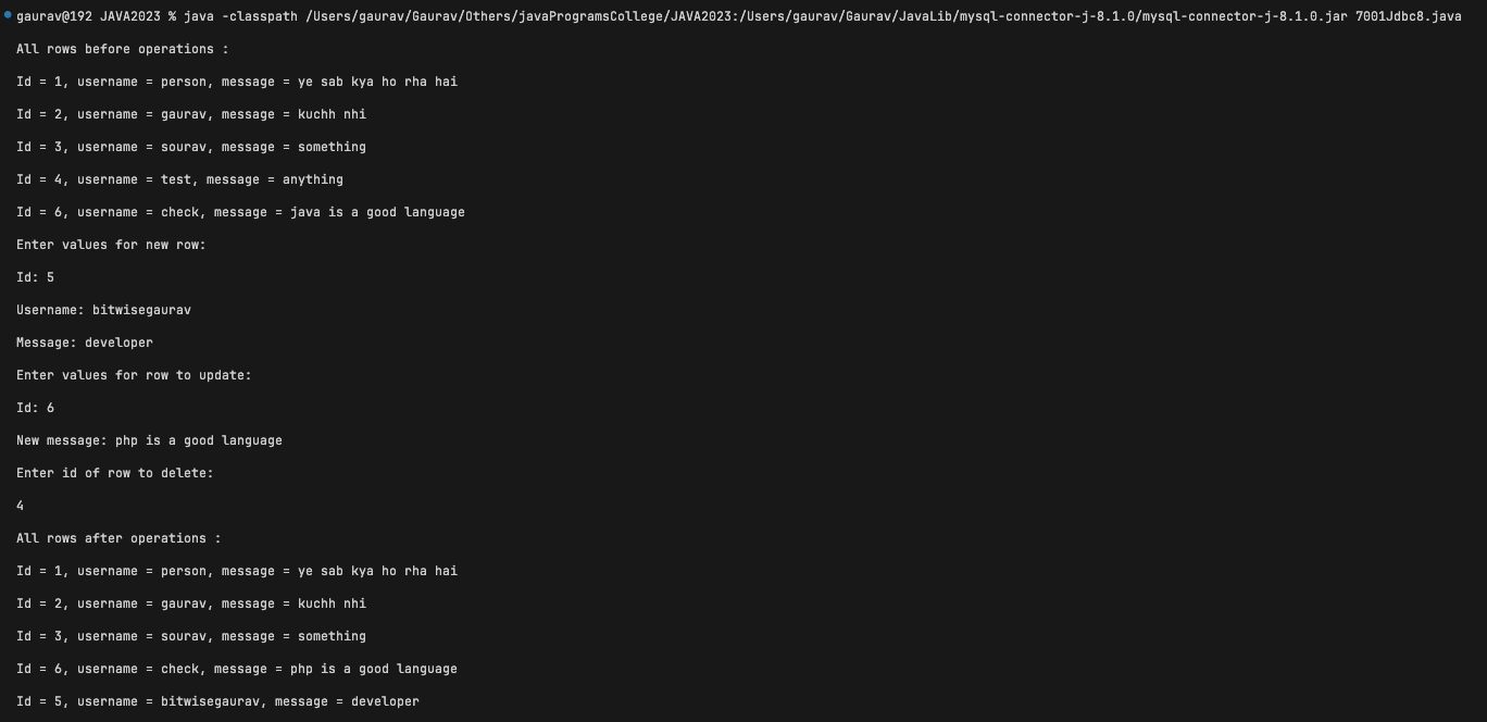 9. Create a Java Program to show, insert, update, delete of the table in Java API through PreparedStatement